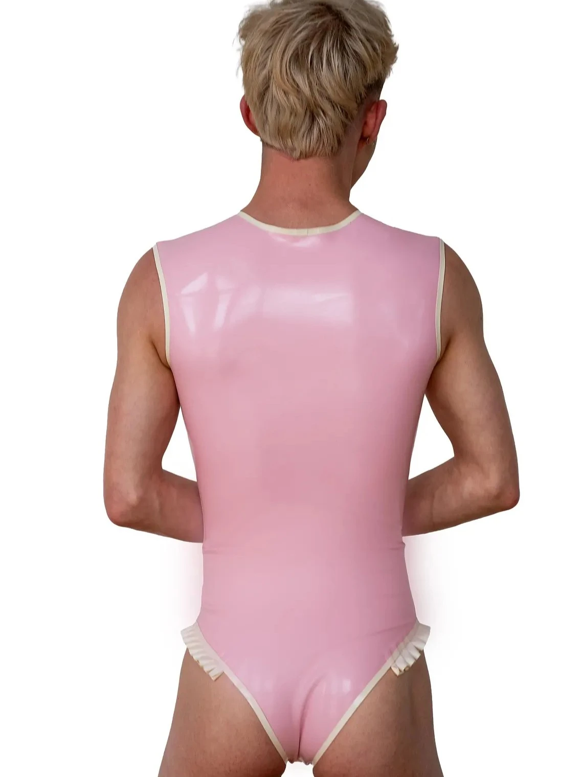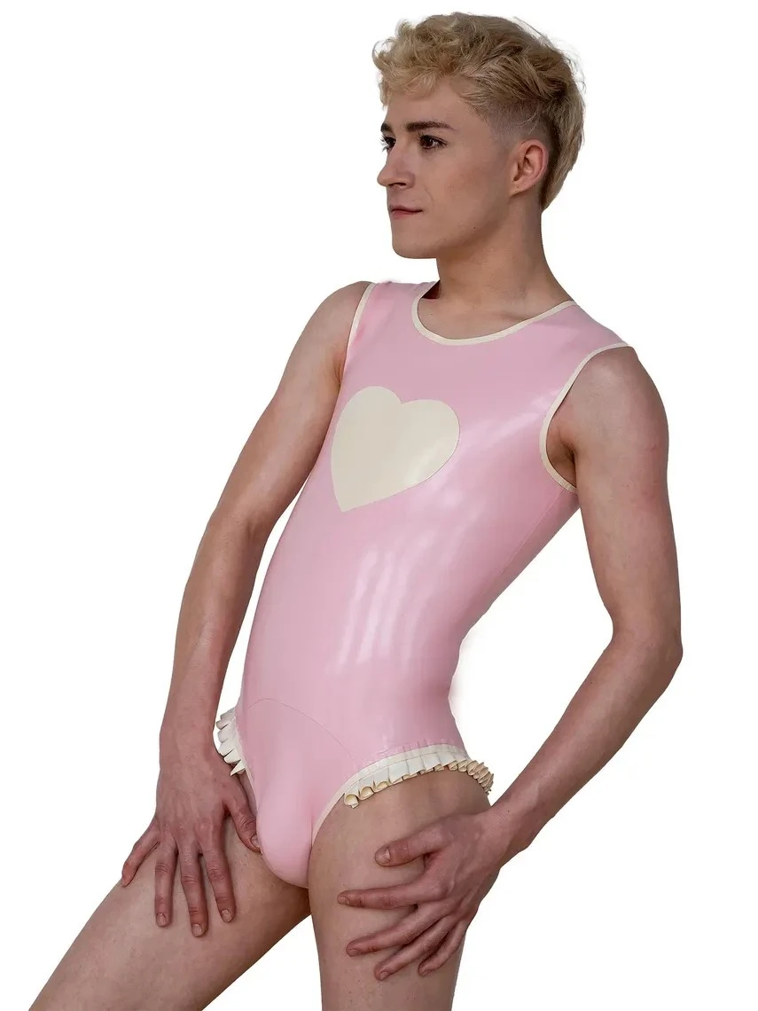 Discover the joy of expression with this feminine latex bodysuit for men, featuring a soft pink finish, a heart applique, and delicate ruffle details