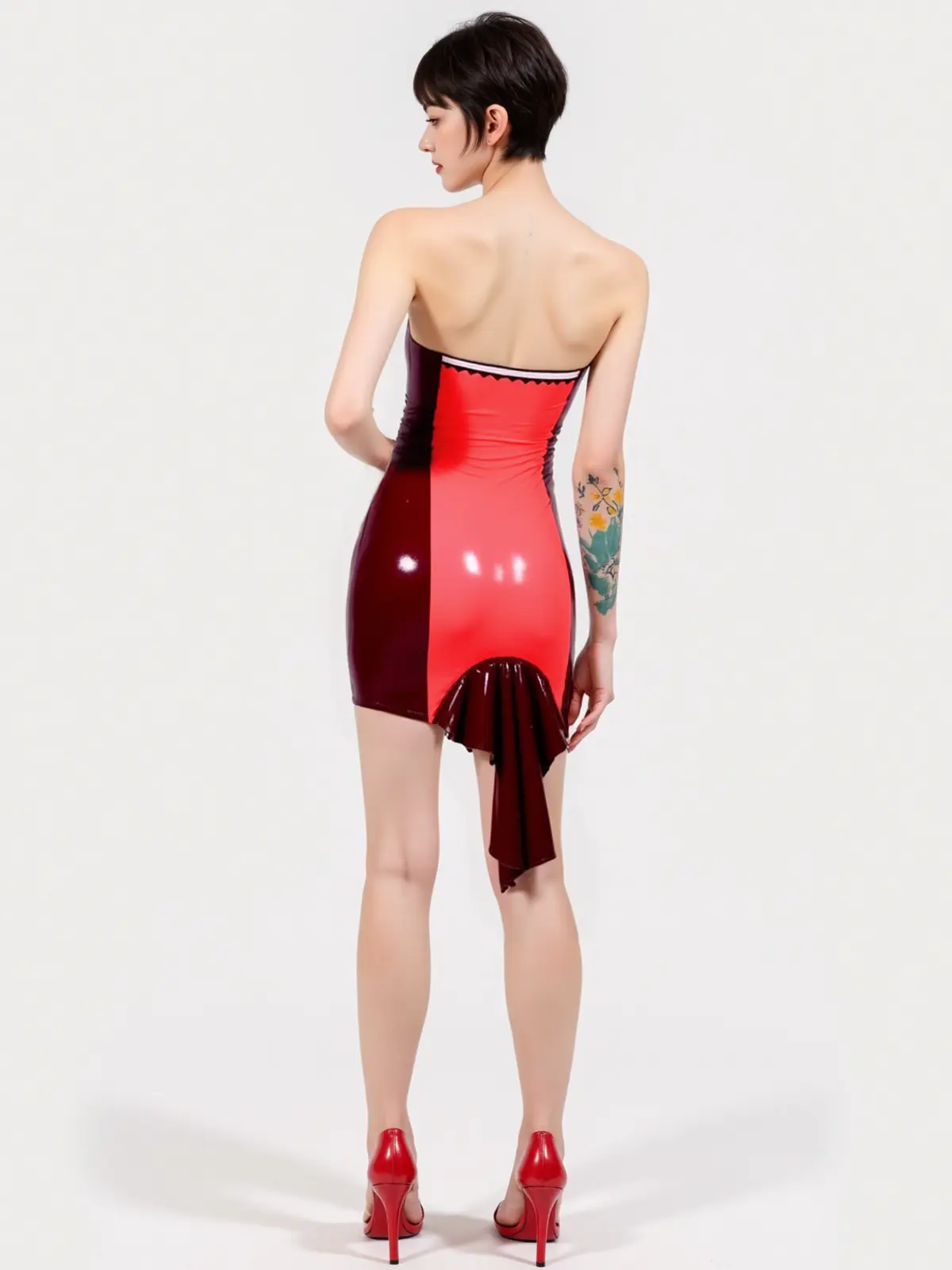 Cute short neckholder latex dress in burlesque style with zip on the front and a short train on the back side. Three buckles and two little decorative bows on the front.