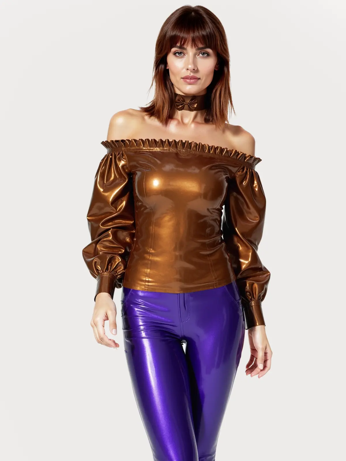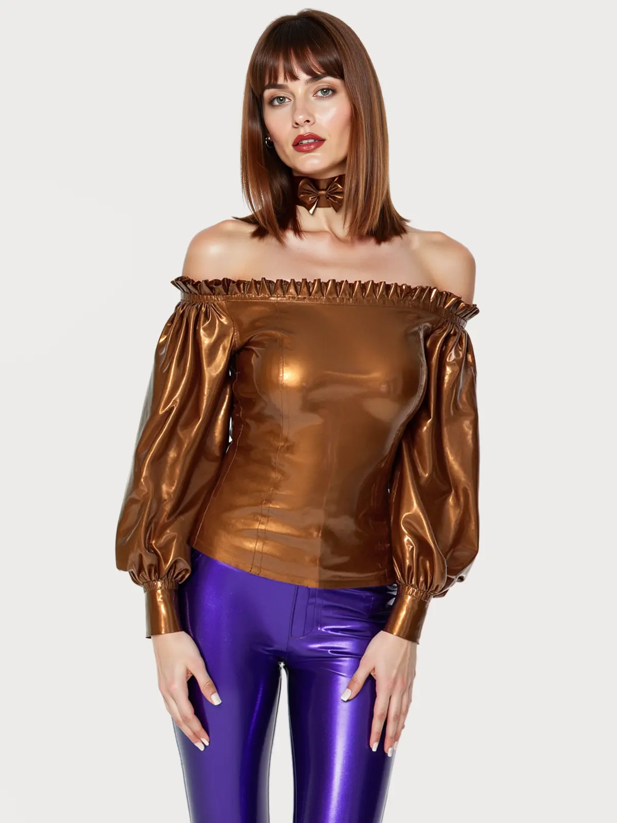 Crafted from glossy metallic brown latex, this top features a rich, lustrous finish that exudes vintage luxury. The off-the-shoulder neckline is framed with a ruffled trim, showcasing the shoulder and neckline for a soft yet edgy appeal.