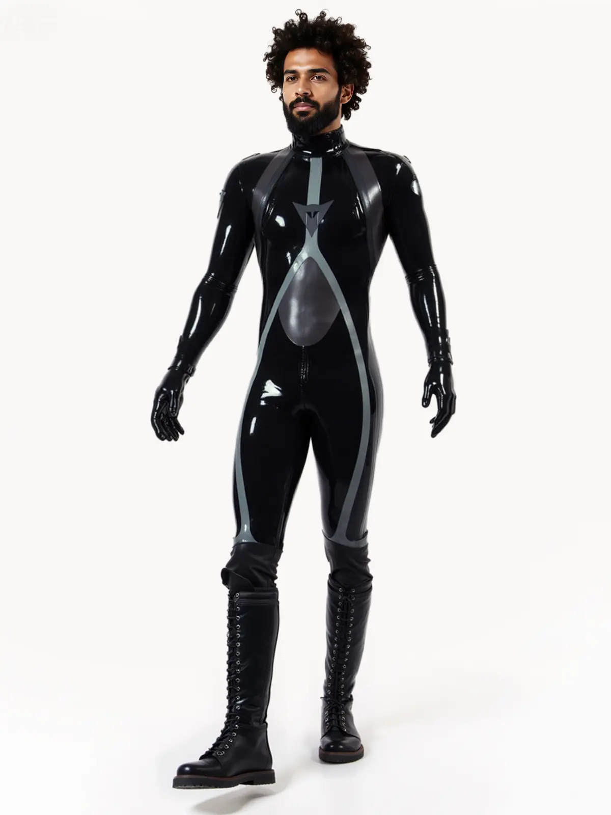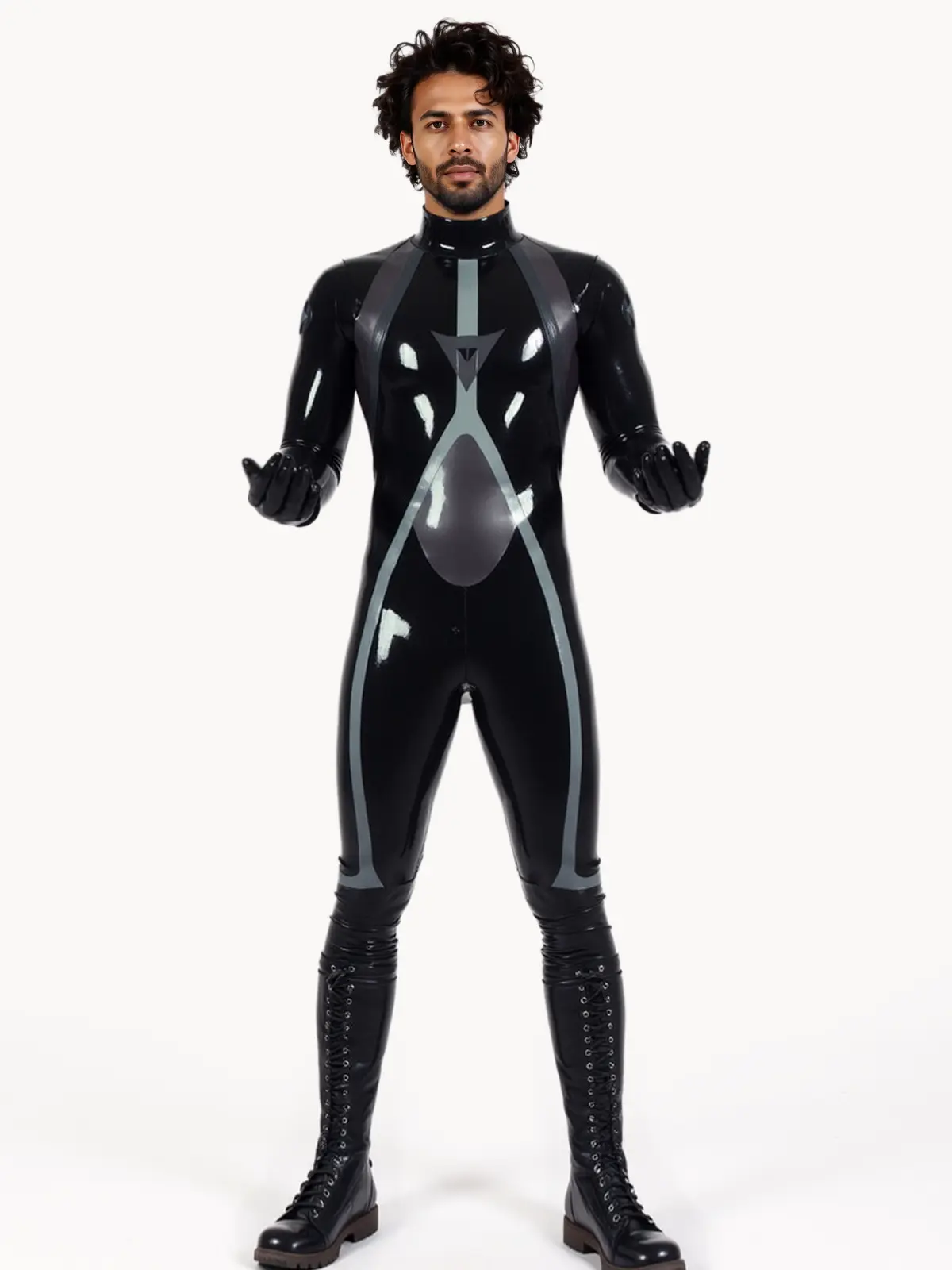 Latex full catsuit designed similar to a ‘T-Age’ style biker’s leathers in three colors;