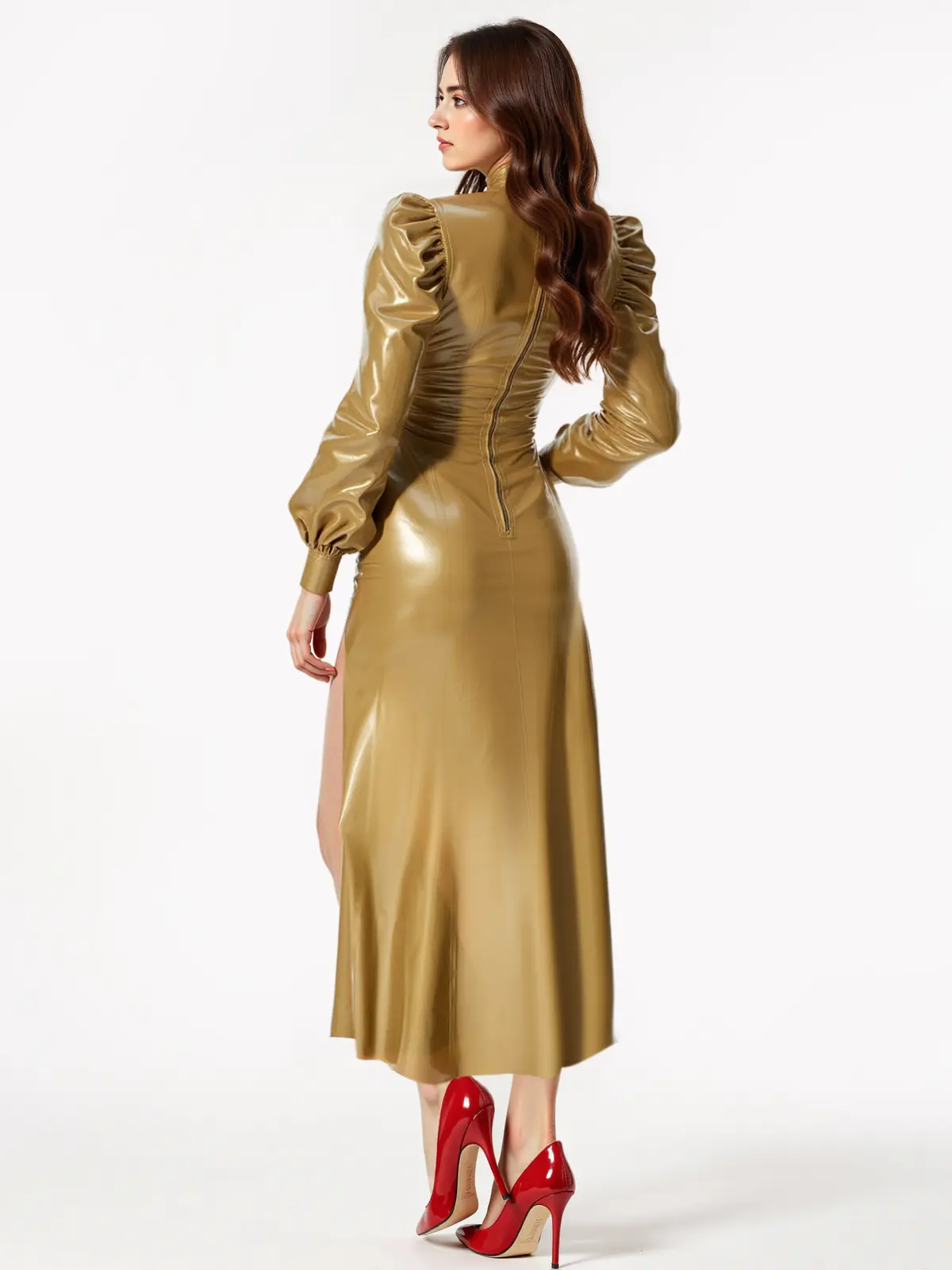 Latex Puff Sleeve Ankle-Length Dress with Bow and Slit