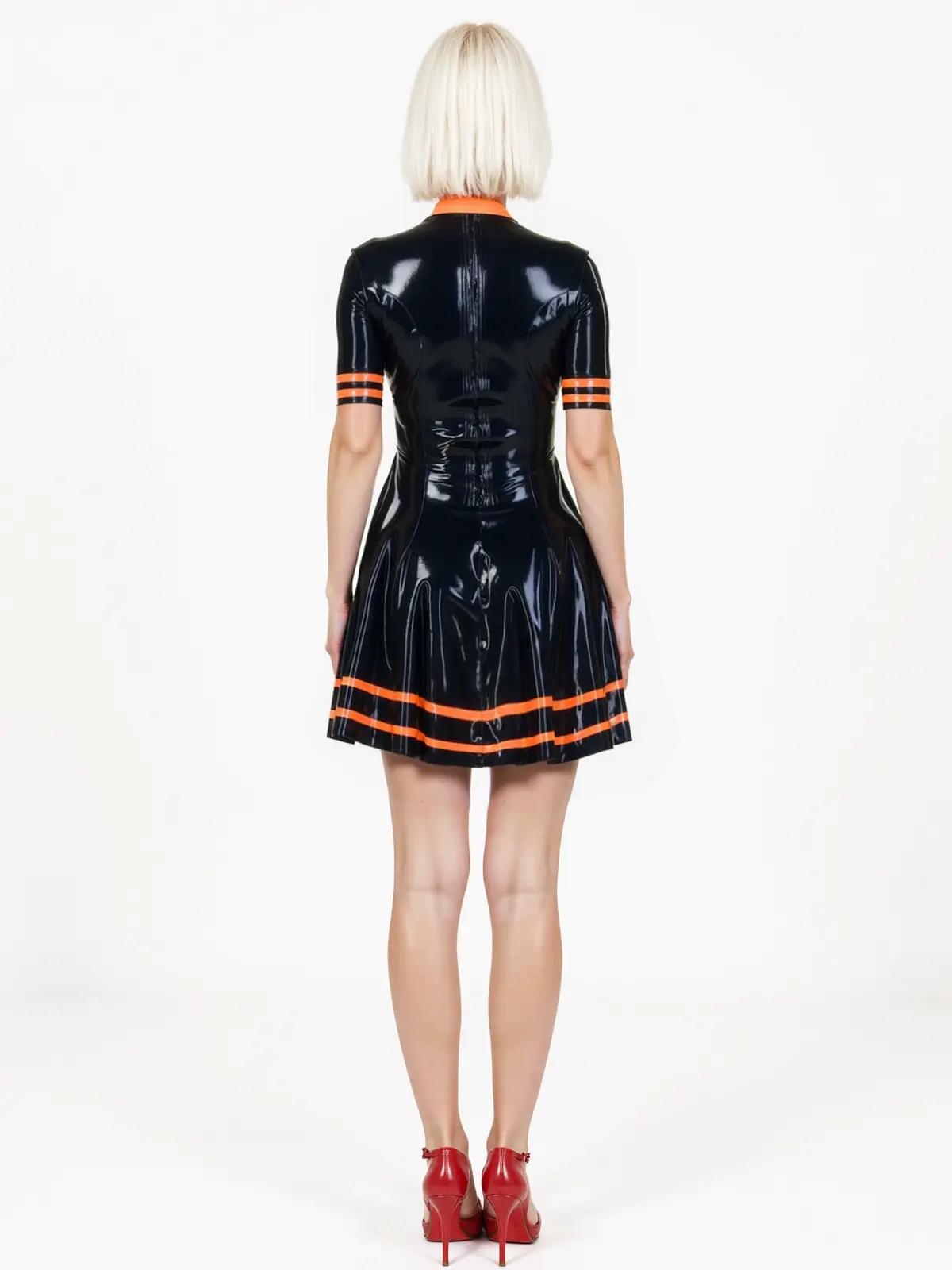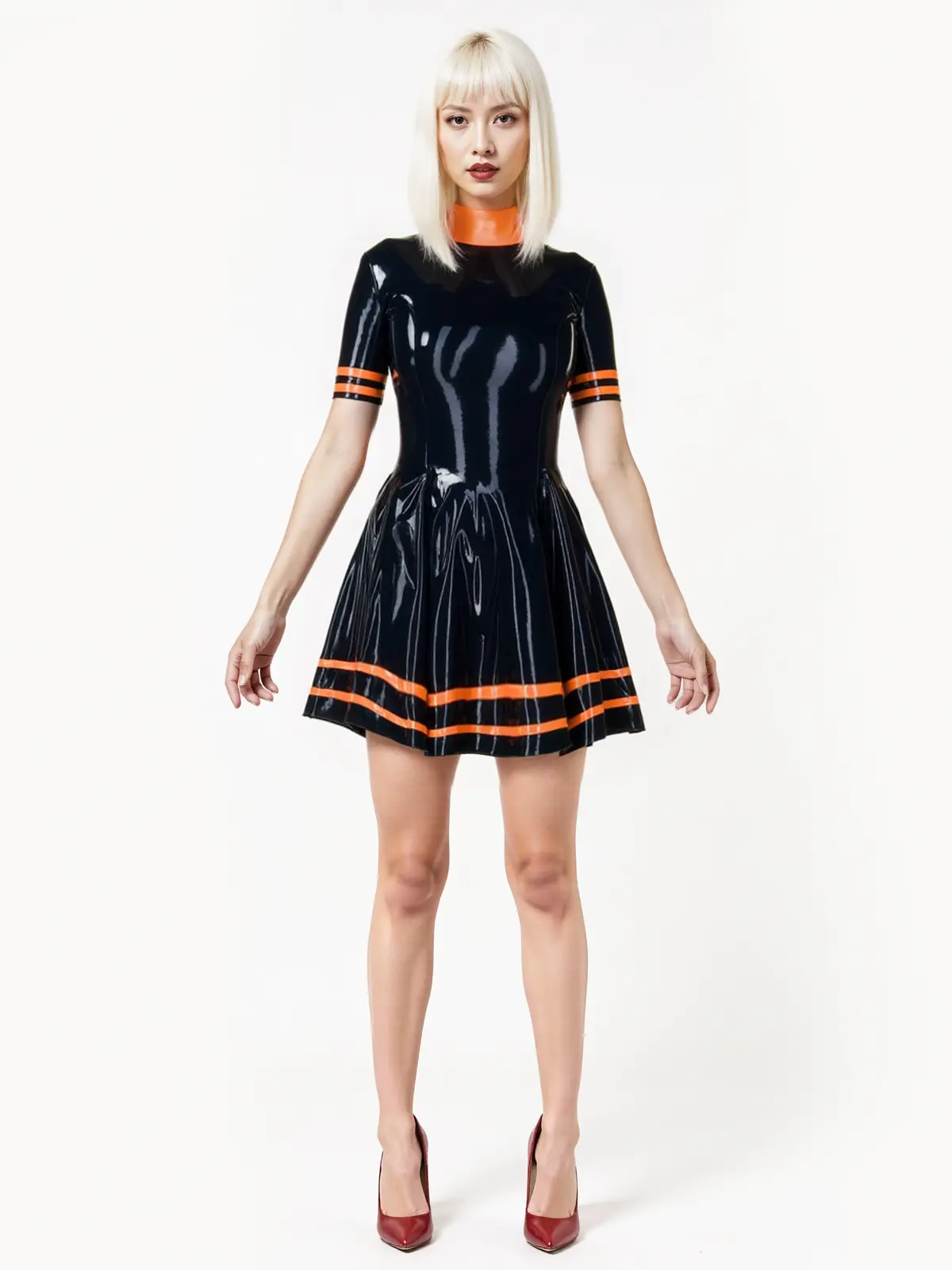This dress is crafted from glossy black latex with a sleek, body-hugging fit that highlights the silhouette.