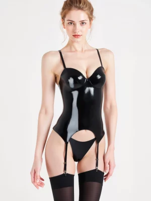 The latex set consists of three pieces: bra, garters with a belt, and panties. They fit tight to the body and look provocative. You can fasten the top (harness) with the help of three buckles and also regulate the height of garters using two buckles on their sides.