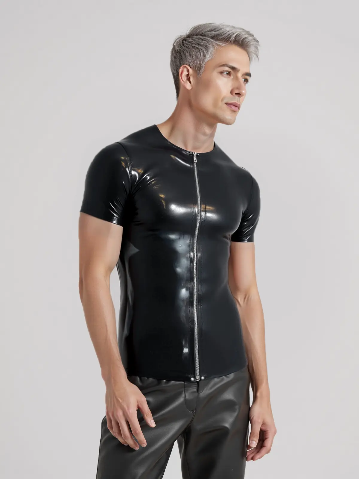 Rubber Latex Crew Neck Zip Front T-Shirt Short Sleeve